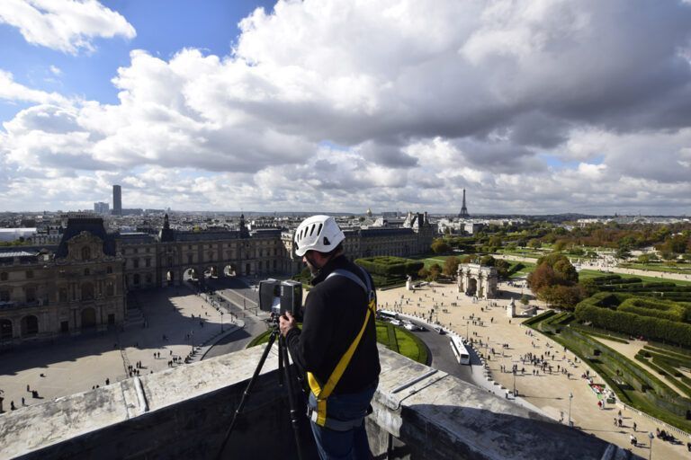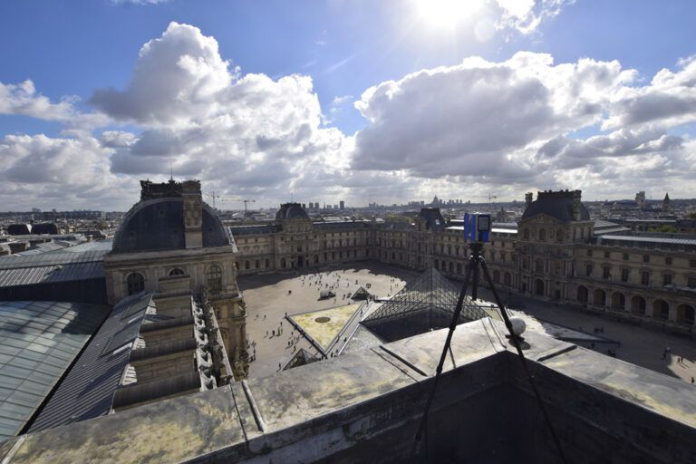 Art Graphique & Patrimoine a réalisé le BIM rétro-conception des toitures du Musée du Louvre, afin de réaliser un diagnostic sur leur état de santé. Le chantier s’est déroulé en plusieurs étapes, à partir notamment d’une campagne de numérisation 3D en lasergrammétrie et photogrammétrie aérienne (drone) : le relevé exhaustif des toitures, qui s’étendent sur une surface totale de cinq hectares, a permis l’assemblage des mesures dans un nuage de points.