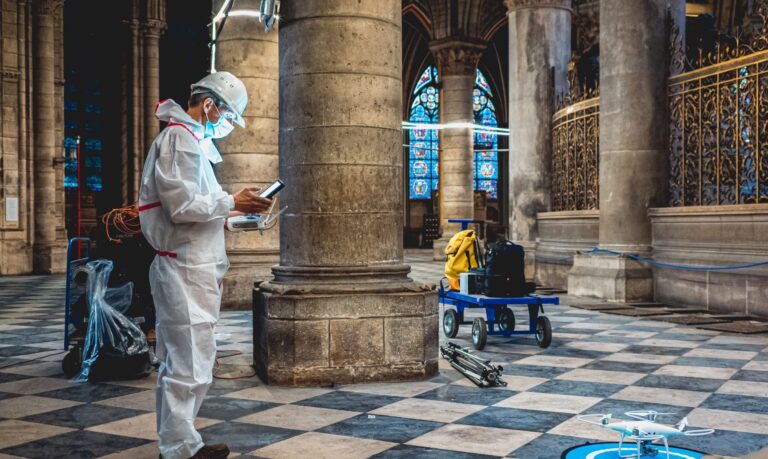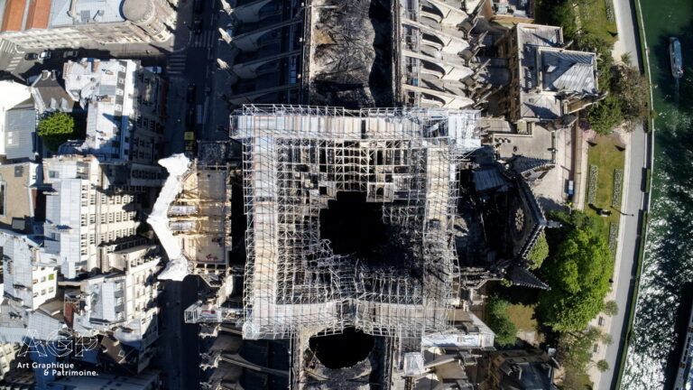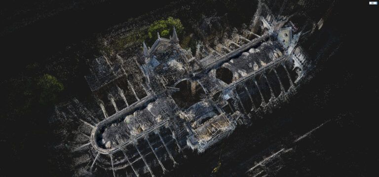 En 25 ans d’ activité, AGP a réalisé plusieurs relevés 3D dans la cathédrale à travers les techniques de scan laser – lasergrammétrie – et de photogrammétrie. Ces données assemblées ont permis de récupérer tous les scans (nuage de points) de la toiture, de la charpente (la « forêt ») et de la f lèche, les éléments disparus lors de l’incendie.